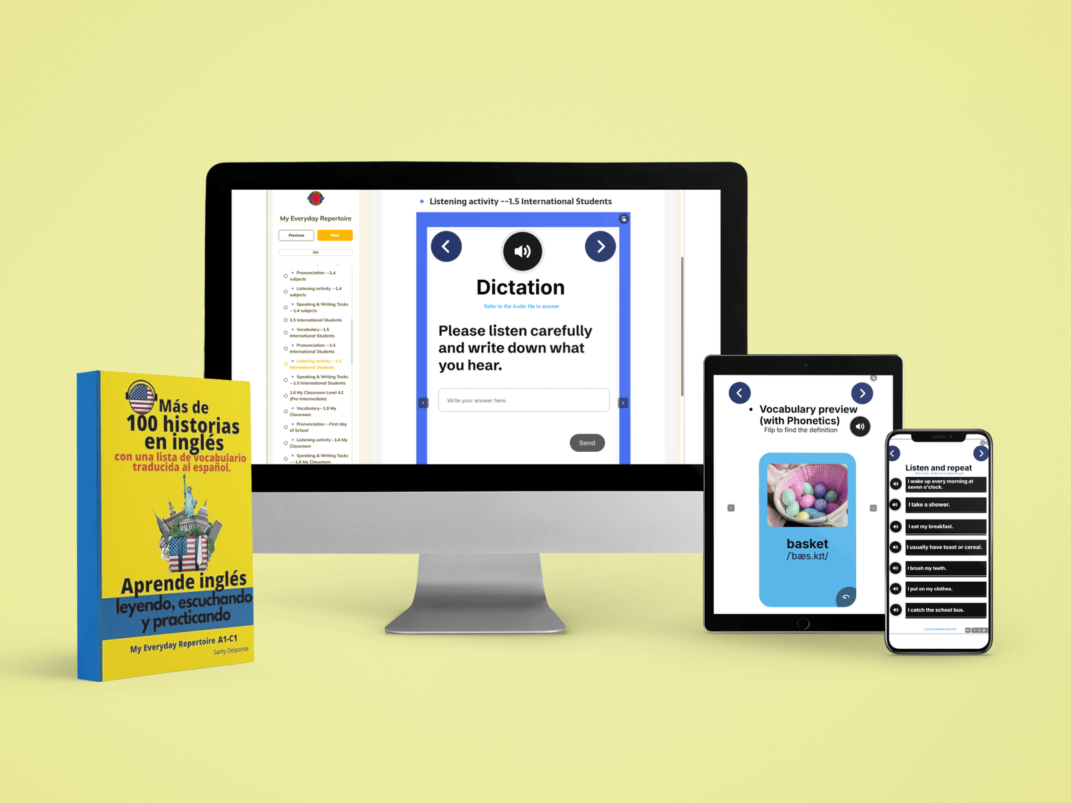Junté el libro, los audios y varias lecciones interactivas en un solo kit gratis para que sientas un avance en los primeros 10 minutos. No hay vueltas — dejá tu email y te lo mando todo al instante. Cuando lo pruebes vas a ver lo simple que es mejorar tu listening y speaking.